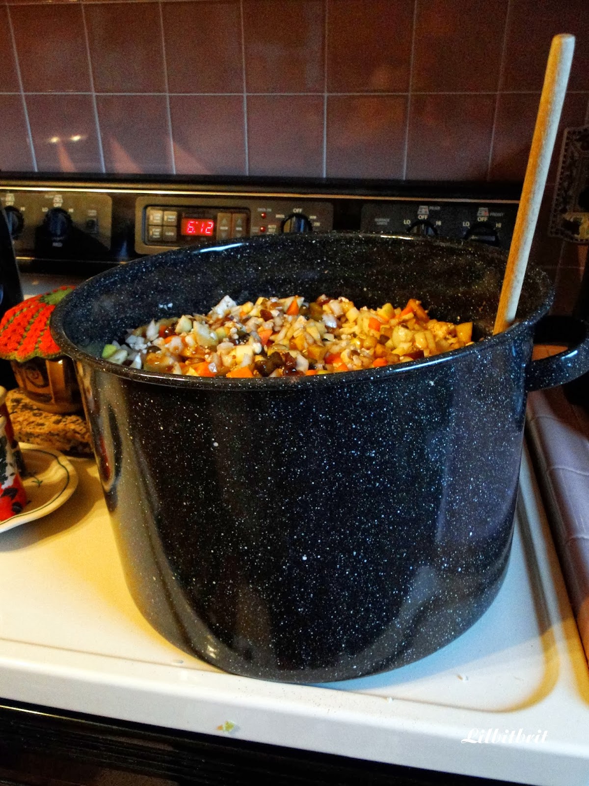 I started at 2:00 PM chopping and at 5:00 PM when the Boy walks in the door I have just finished getting all the ingredients into the pot, fortunately it did hold them all. I turn it on for a slow simmer. Mr B. walks in the door just after 6:00 PM and it is simmering away. Now this needs at least 2 hours to cook. By then I've been standing all afternoon and am totally pooped. So I said to Mr. B. he will have to help me get all the jars from the basement, wash them, sterilize them in the oven, etc.