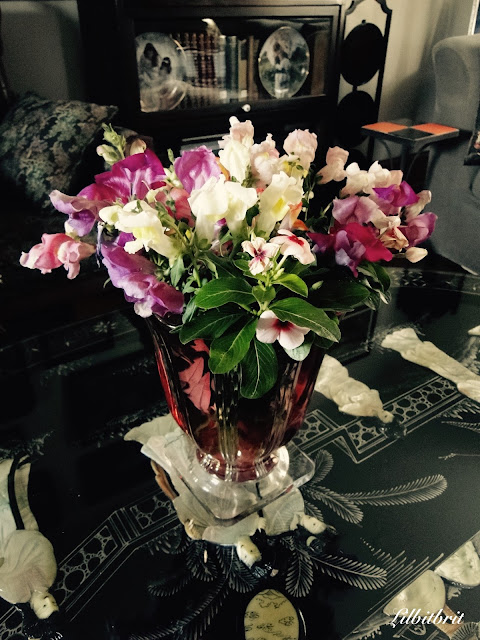She wore a large white hat - what was called a "restaurant hat" - with a transparent brim and a huge pink rose in front, and the same kind of rose was fastened to the belt of her white lace dress.
